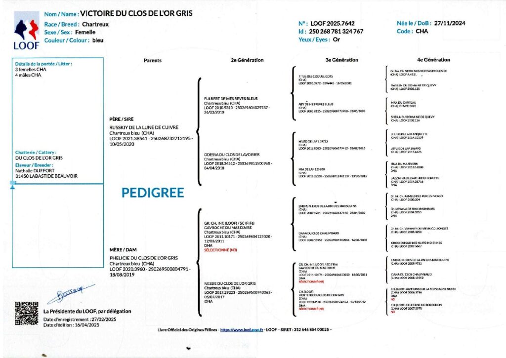 Victoire est la fille de Phélicie du Clos de l’or gris . Elle est née dans notre élevage familial et est issue de notre superbe lignée que nous avons à coeur de poursuivre depuis plus de 25 ans avec toute notre passion et notre expérience . Victoire représente notre quatrième génération ce qui en fait notre plus grande fierté. C’est une chatte magnifique en tout point . Très présente dans notre maison, elle est curieuse, élégante et pleine de douceur. Elle a un fort caractère et sait se faire respecter des autres chats. Elle est très joueuse, raffole de câlins, c’est un véritable « pot de colle » mais on adore ça .