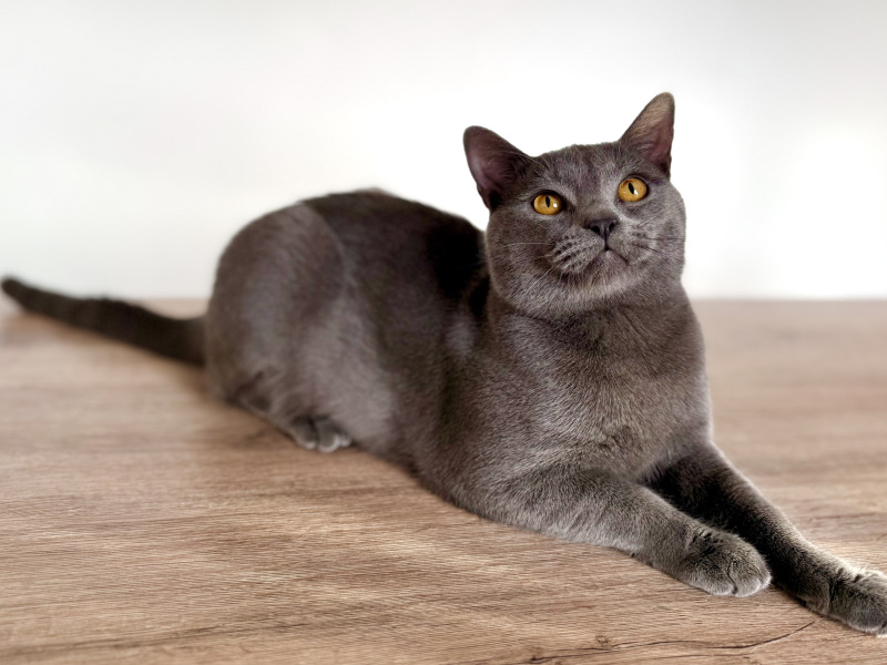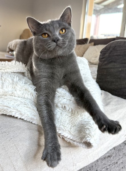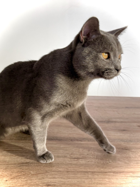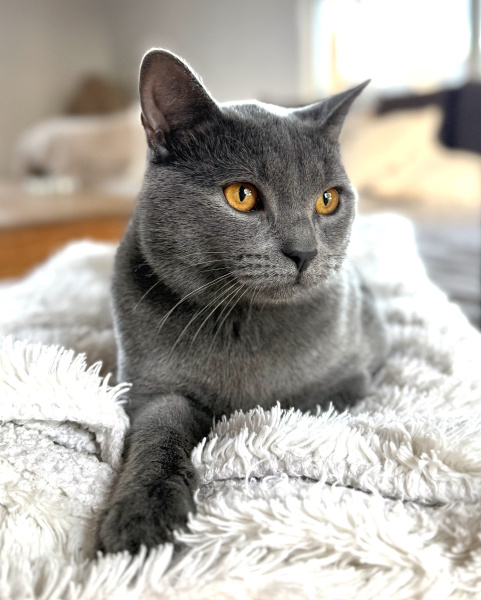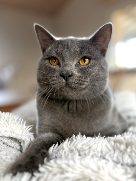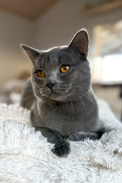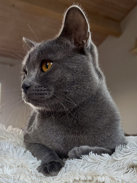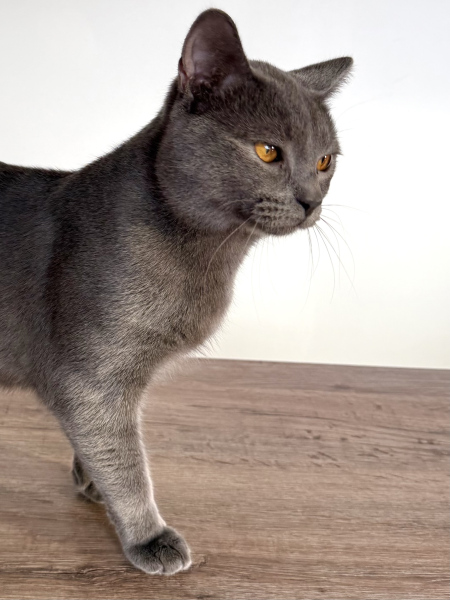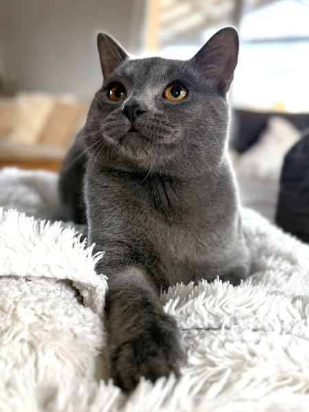 Achille est le pacha de notre famille chartreux , il a rejoint notre maisonnée et nos demoiselles chartreux en juin 2025 . Issu de superbes lignées de grands champions il est non seulement magnifique mais tellement adorable de caractère, c’est un beau matou câlin extrêmement attachant et très doux . Il ronronne à souhait d’un simple regard de ses maîtres . Musclé et bien charpenté, il a de très jolies bajoues, des yeux magnifiques d’un cuivre intense à faire tomber ces dames, une robe bleue ardoise avec une belle texture, un profil parfait et de superbes oreilles bien placées.