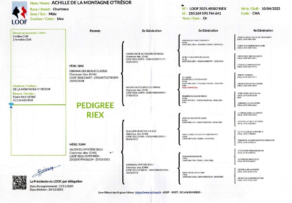 Pedigree d’Achille de la Montagne O’Trésor